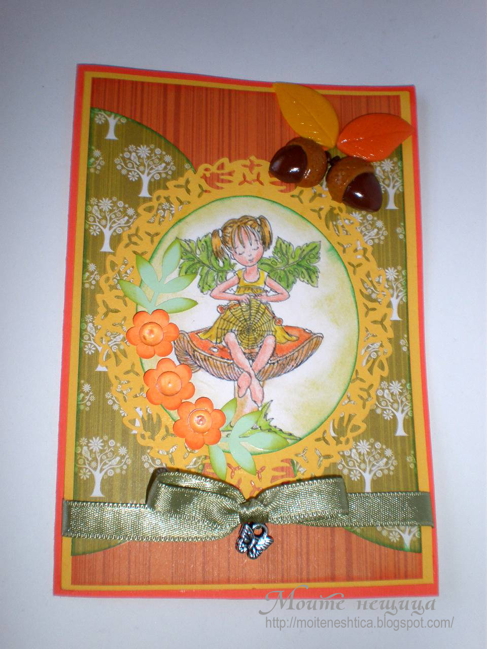 Обичам есента, с цялото и многообразие от топли цветове. За мен това е най- колоритния сезон. С удоволствие, бързо и лесно направих тази картичка. Жълъдчетата и листенцата са от фимо и са ми подарък от Нети. Почти цяла година си ги пазих за подходящия повод :).